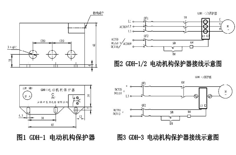 二、主要技术参数 1、保护功能:断相保护、过载(堵转)保护 2、整定电流误差:=土5 % 3、适用范围: GDH-1:控制电压:DC:110 /220V AC:220 V 电 机:AC:380 V GDH-2 :控制电压:AC:380 V 电 机:AC:380V GDH-3:控制电压:DC:110 /220V 电 机:DC:110/220 V 4、适 用 频 率:45~65HZ 5、断相、堵转动作时间:3秒±1S 6、输出接口复位方式:控制回路断电复位 7、输出接口复位时间:= 60秒 8、工 作 方 式:连续 9、工 作 位 置:任意 10、环 境 温 度:-25℃~+60℃ 11、环 境 湿 度: <90%(25℃) 三、安装使用 1、将电动机的三相电源线分别穿过电动机保护器的 三只穿线孔,相序任意。 2、将电动机保护器的输出接口串入交流或直流接触 器的控制回路,K1、K 2任意。 3、图1为电动机构保护器外形图,可2孔或3孔安装, 3 孔时可以使用任意两孔安装, 图4、图3为典型 使用接线图。 四、注意事项 由于本电动机保护器的输出接口采用无触点的固 态式无源电子开关,故检验开关的通断特性不能简单 的用万用表电阻档来测量。检测其它电路时可以将该 接点K1、K2 短接。